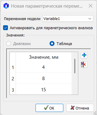 - Укажите переменные модели для параметрического анализа в окне Новая параметрическая переменная: