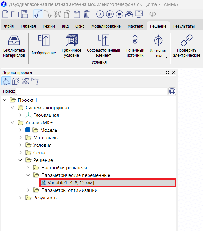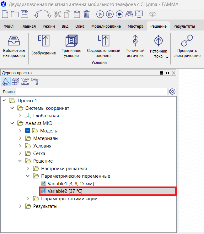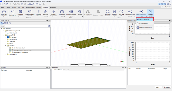 - На вкладке Решение нажмите кнопку Параметрический анализ и в открывшемся меню выберите Новая переменная.