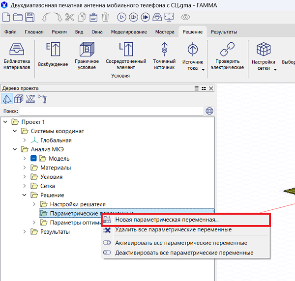 Также в дереве проекта можно развернуть Анализ МКЭ - Решение, нажать правой кнопкой мыши на Параметрические переменные и в открывшемся меню выбрать Новая параметрическая переменная.