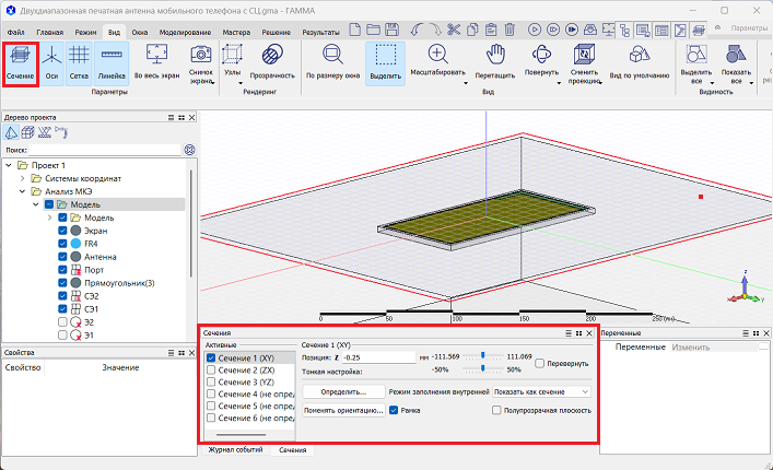 Чтобы отобразить панель поперечных сечений, на вкладке Вид нажмите Сечение.
