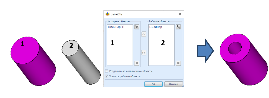 - В диалоговом окне Subtract (Вычитание) в поле Blank object (Пустой объект) перечислены объекты, из которых необходимо вычесть (1), а в поле «Инструментальные объекты» – Tool objects (Объекты вырезания) (2).
