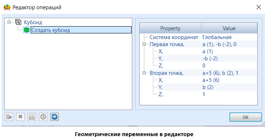 - После того, как вы определили переменные модели, вы можете установить их как числовые значения, основные арифметические операции (+,-,,/) и числовые выражения (-ax2+b) прямо в редакторе операций, в диалоговых окнах команд модификации или в окне свойств.
