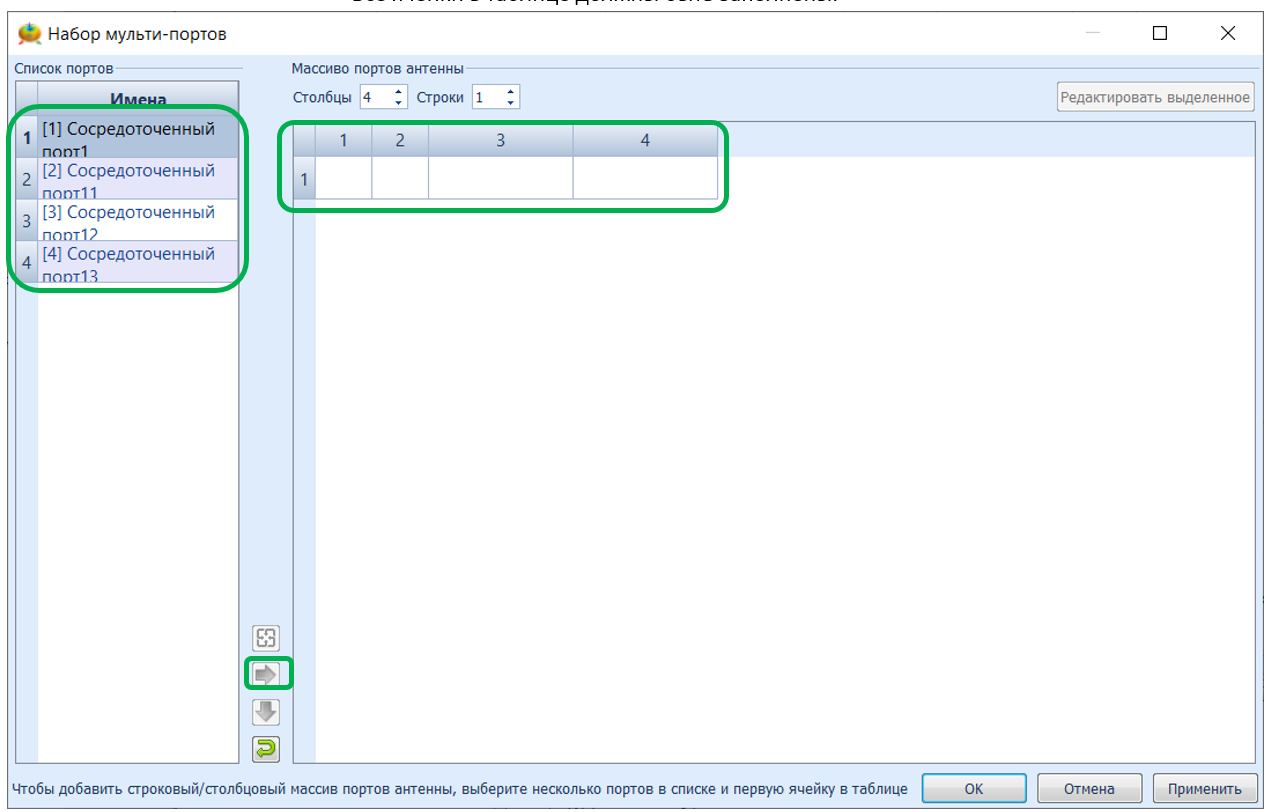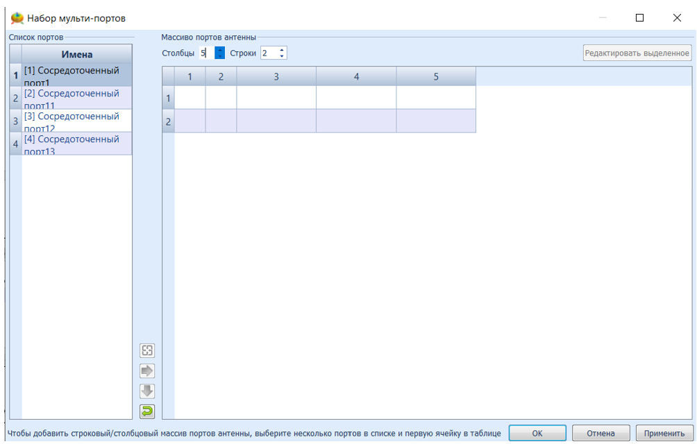- Появится диалоговое окно Define Antenna Array (Определение антенной решетки) со списком рассчитанных портов.