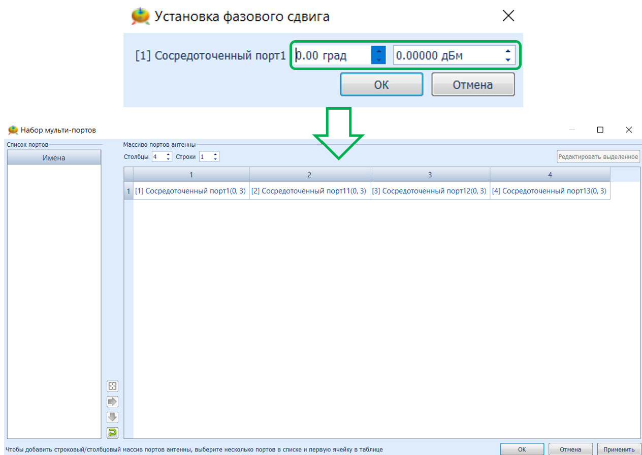 - В диалоговом окне Setting up phase shift (Настройка сдвига по фазе) установите амплитуду /фазу для всех портов и нажмите set (установить), затем нажмите OК.