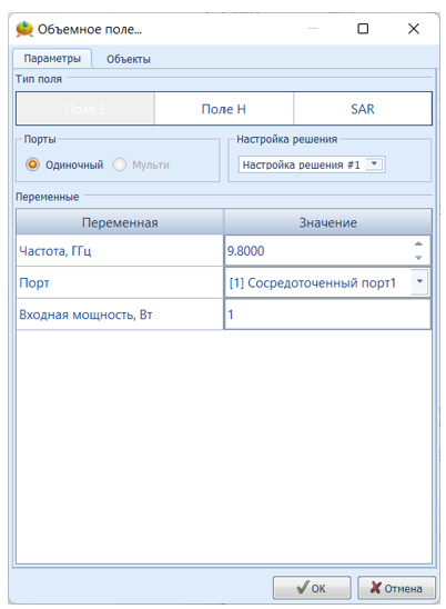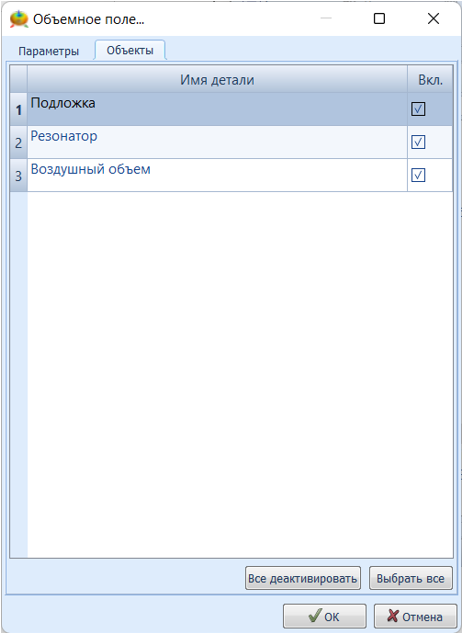 - Во вкладке Объекты выберите объекты, для которых будет построено объемное распределение полей (например, вы можете оставить только модель головы). Нажмите ОК. • Нажмите Убрать все, чтобы снять отметку со всех объектов, а затем в средстве 3D-просмотра выберите объект, для которого необходимо построить объемное поле.