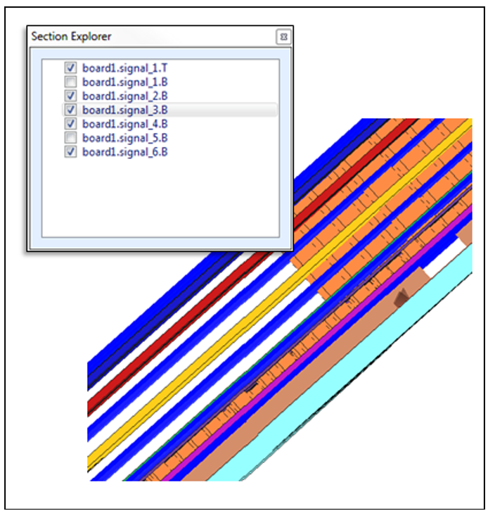 В программе можно построить определенное распределение поля на плоскости сечения любого слоя печатной платы. Разделы для всех слоев платы заданы заранее. Вам не нужно создавать их в разделе Результаты > Сечения, как описано в разделе Создать сечение.