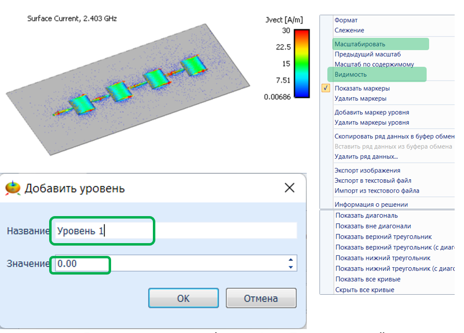 Чтобы настроить и изменить параметры и графическое изображение определенного результата моделирования, используйте контекстные меню. Кликните правой кнопкой мыши на созданном графике, распределении поля или диаграмме направленности, чтобы получить доступ к функциям на основании их содержания.