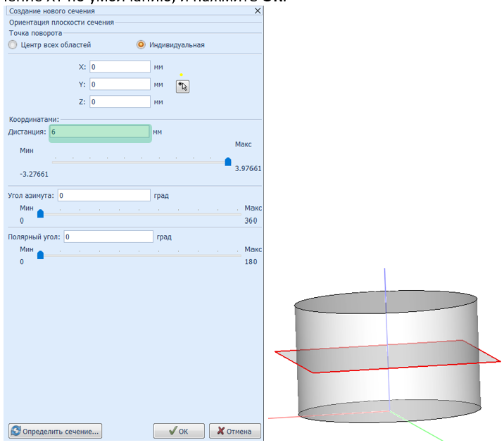 - Воспользуйтесь элементами управления окна Создать новую секцию, чтобы расположить сечение XY по умолчанию, и нажмите ОК.