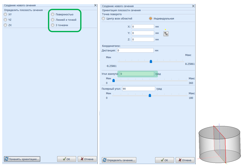 - Чтобы изменить сечение XY по умолчанию, нажмите Определить сечение и выберите нужную плоскость из списка, затем нажмите Изменить ориентацию, чтобы расположить ее.