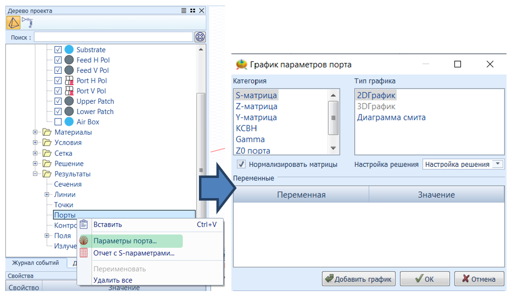- Дерево проекта > Результаты > щелкните правой клавишей мыши на узел Порты > График параметра порта.