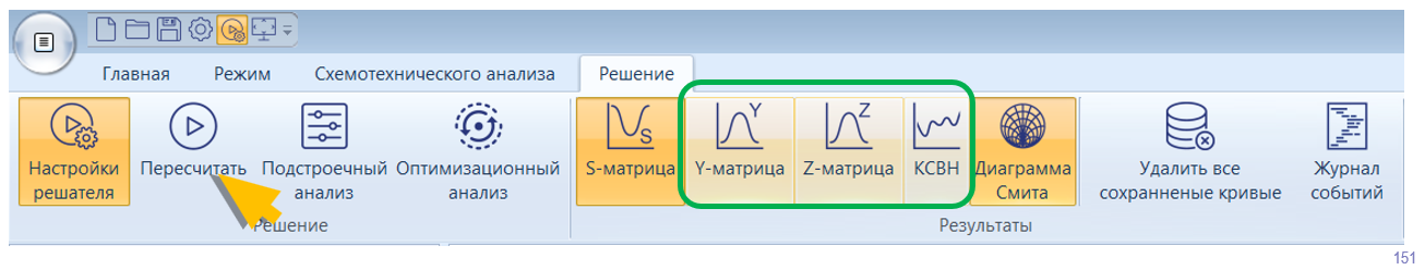 - Если вы измените топологию цепи или входные параметры после моделирования, окно результатов станет серым и отключится. Пересчитайте обновленную цепь во вкладке Simulation > Recalculate, чтобы активировать окно результатов.