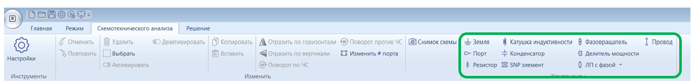 Откройте элементы цепи во вкладке СА > группа Components (Компоненты) нажав соответствующие кнопки в панели инструментов: