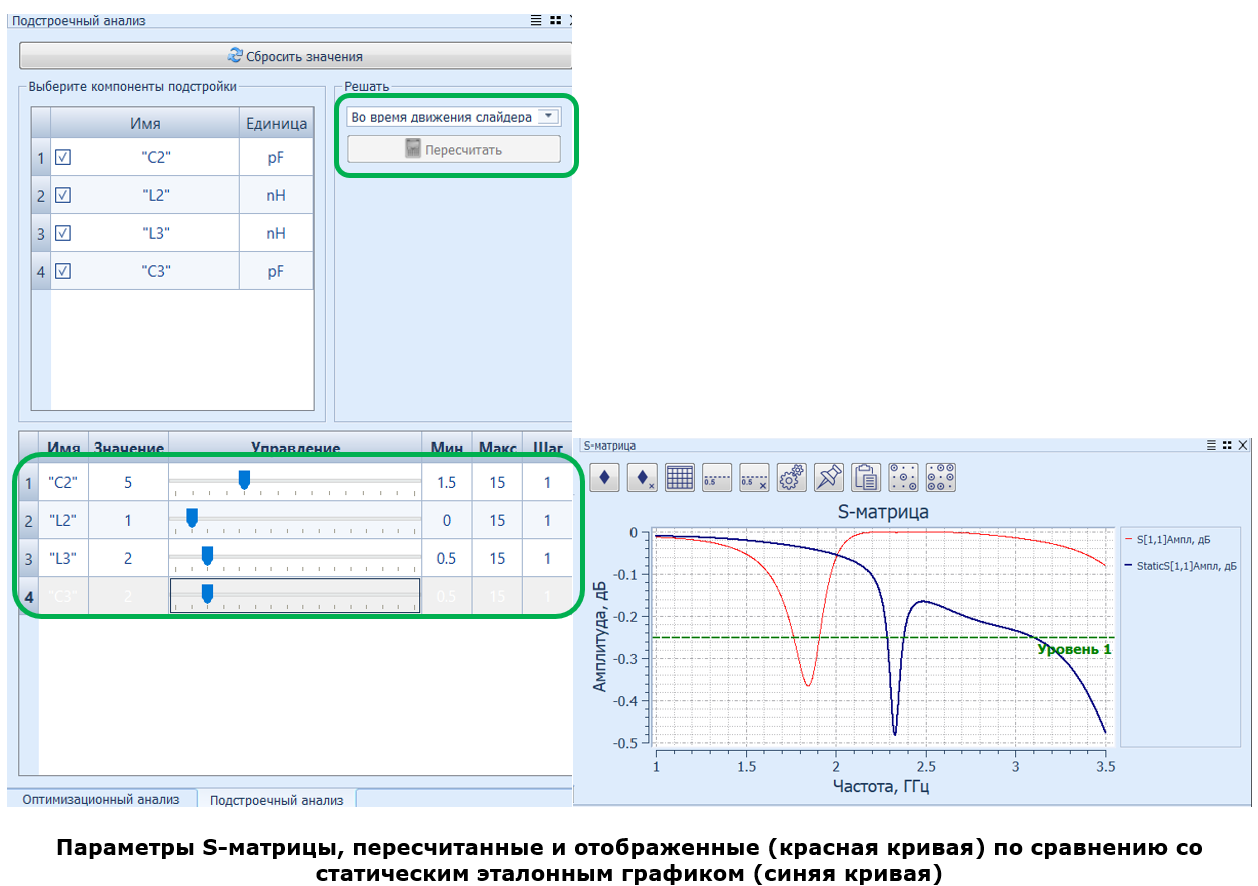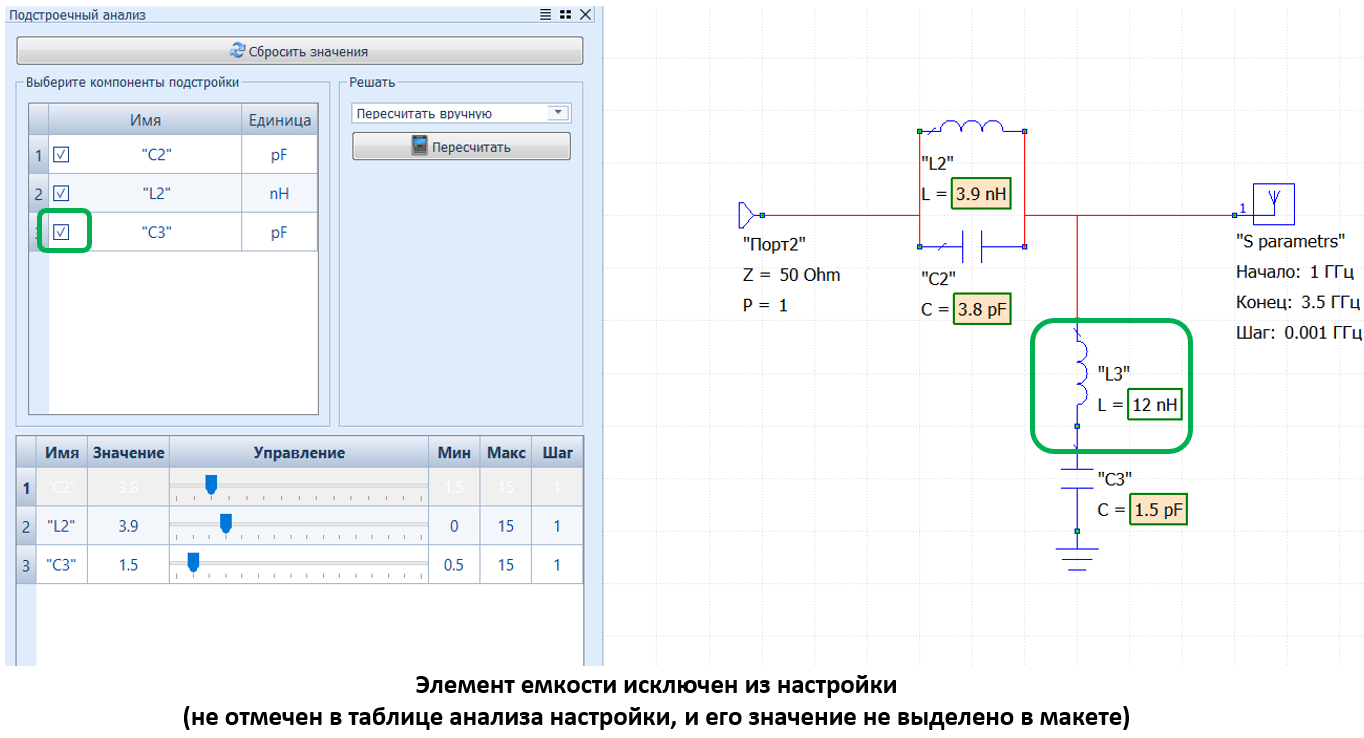 - Обратите внимание, что в окне Tuning Analysis отображается список компонентов цепи, доступных для настройки.