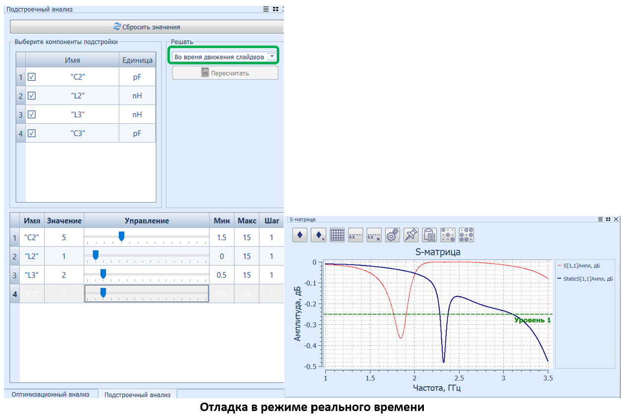 - Выберите результирующий график (S-Матрица, КСВН, и т.д.) для отладки во вкладке Simulation.