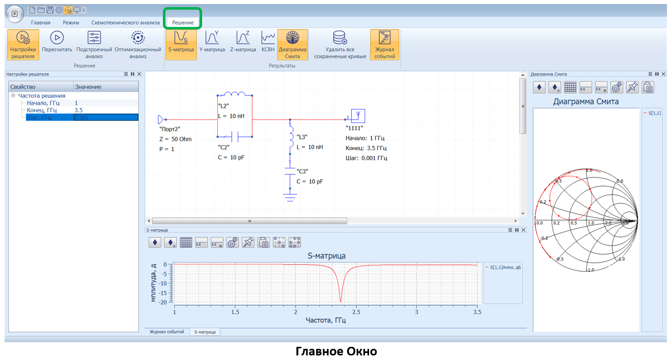 - Settings/Analysis Window (Окно настроек/анализа) - позволяет задать настройки решателя для моделирования текущей цепи и настроить параметры и оптимизацию.