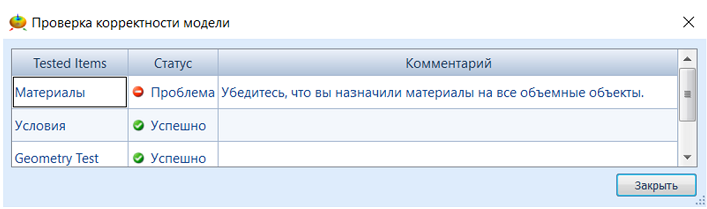 | Материалы | Убедитесь, что вы задали материалы всем твердым объектам. | Назначьте материалы всем твердым объектам |