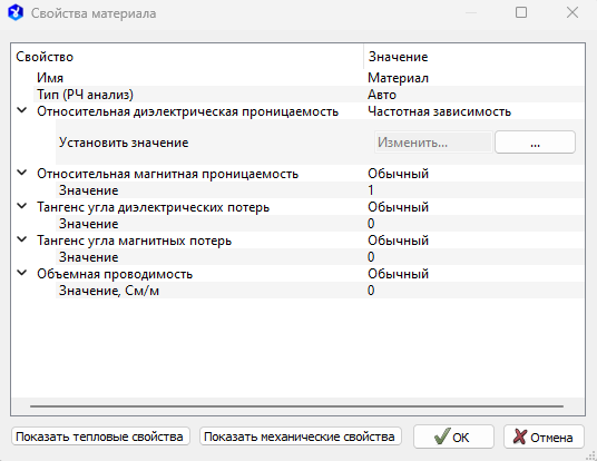 Для создания частотно-зависимого свойства при создании или редактировании материала требуется выбрать значение свойства «Частотная зависимость»: