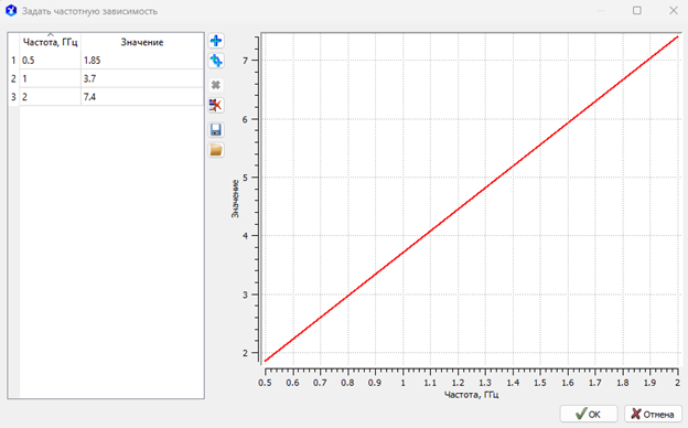 После ввода необходимых значений необходимо подтвердить действия кнопкой «ОК». Таким образом задано частотно зависимое свойство для материала.
