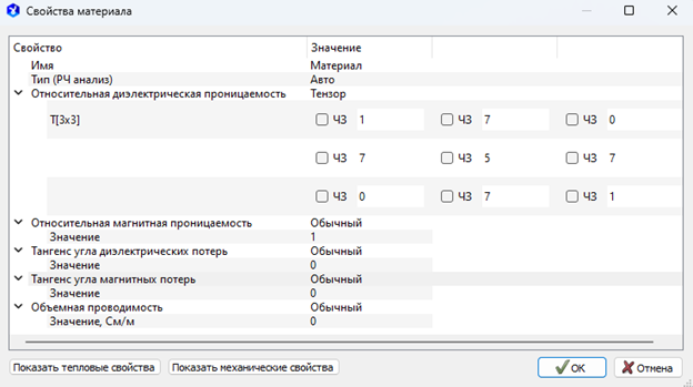 При необходимости работы с частотно-зависимым тензорным материалом следует активировать кнопку