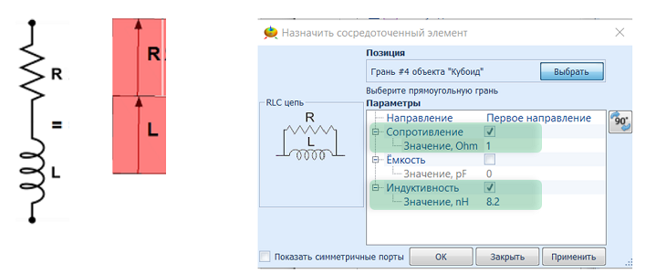 Вручную соедините два прямоугольных сосредоточенных элемента в модели и назначьте каждому R, L или C: