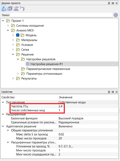 - Задайте значения для параметров Частота и Число собственных мод. Для других параметров оставьте значения по умолчанию.