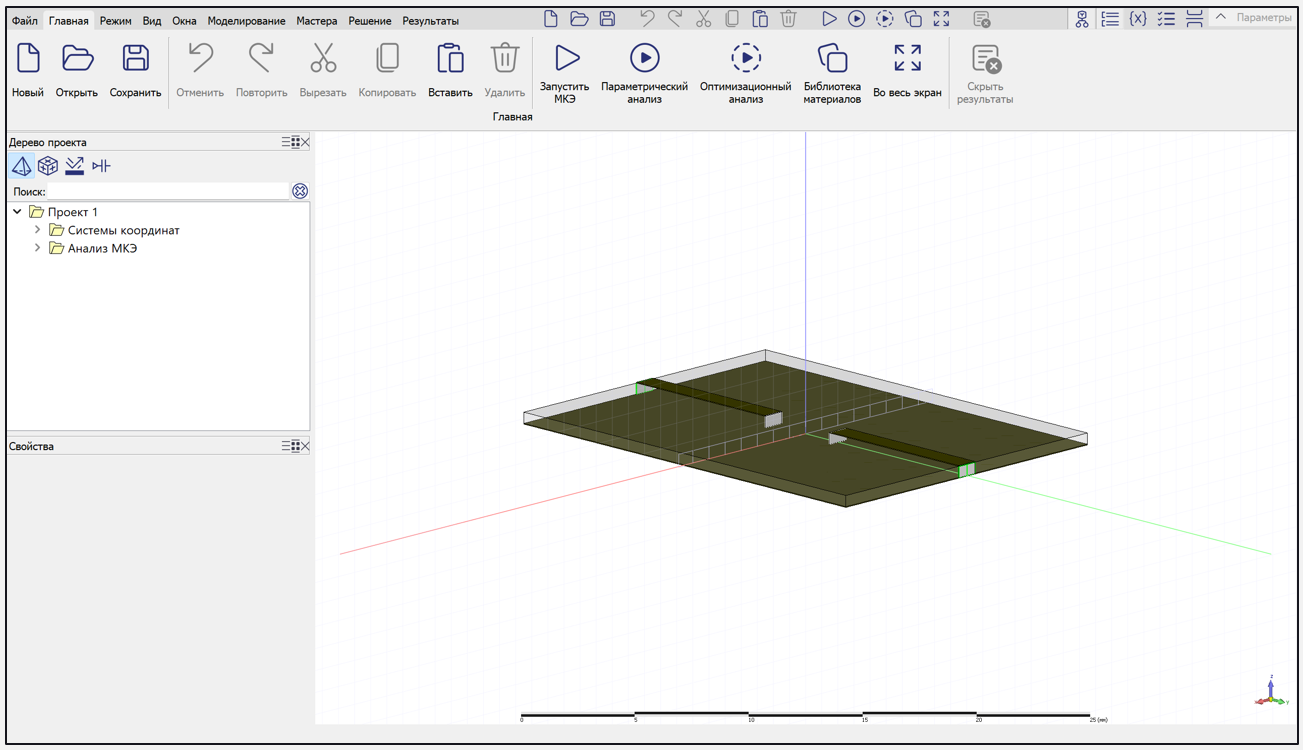 В главном окне программы откроется выбранный проект. В проекте содержится модель линии передачи, в которую нужно импортировать S-матрицу полосно-пропускающего фильтра.