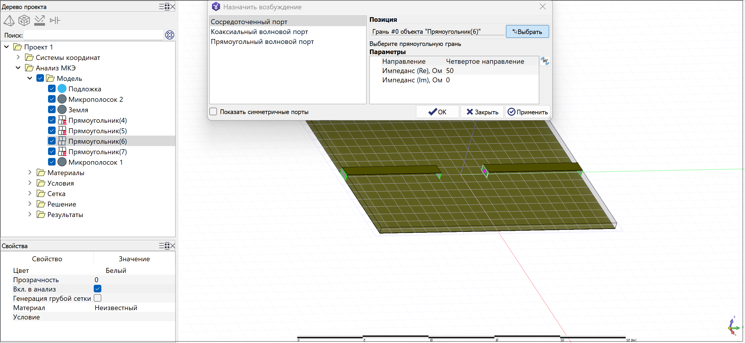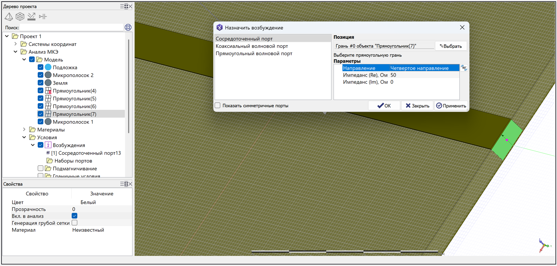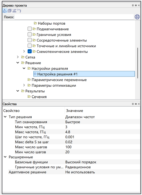 В дереве проекта будет создан схемотехнический элемент (Проект – Анализ МКЭ – Условия – Возбуждения – Схемотехнические элементы – Схемотехнический элемент 1).