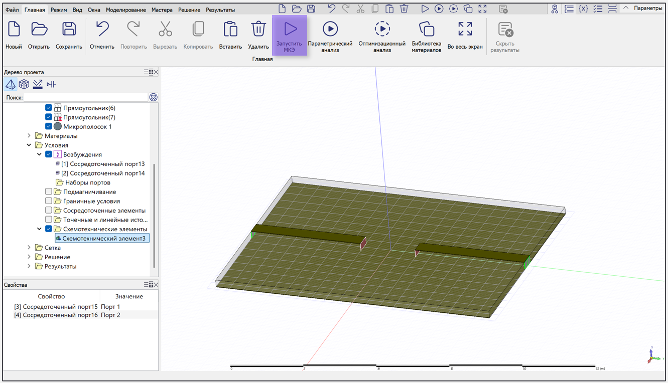 - В меню Файл выберите: Примеры проектов – МКЭ – Линия передачи для импорта S-параметров.