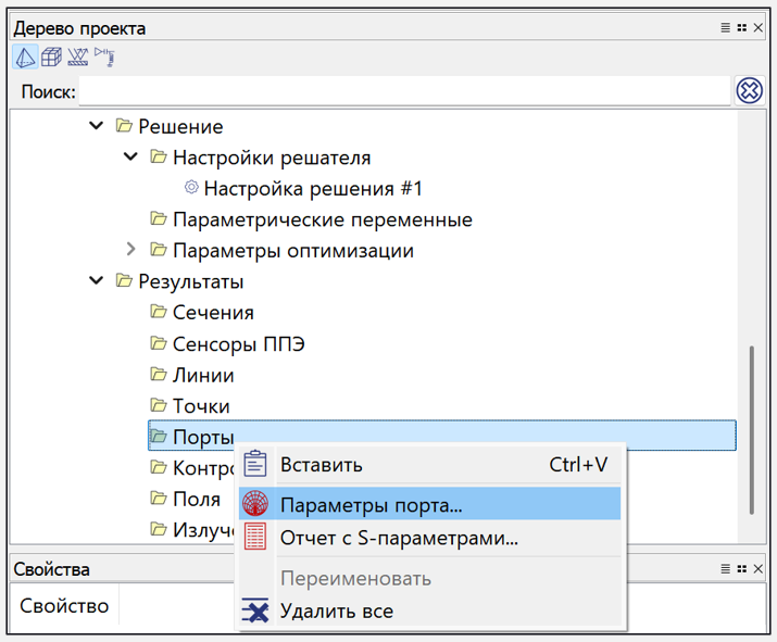 - В папке Результаты кликните правой кнопкой мыши на папке Порты и выберите Параметры порта.