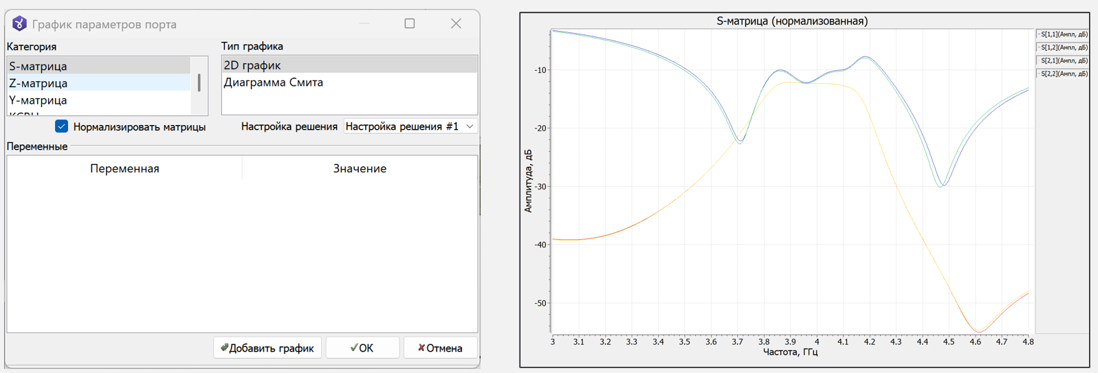 - В открывшемся диалоговом окне проверьте, что в поле Категория выбрано S-матрица, в поле Тип графика выбрано 2D график.