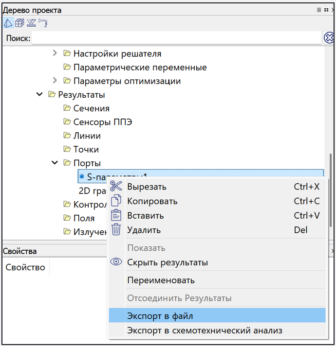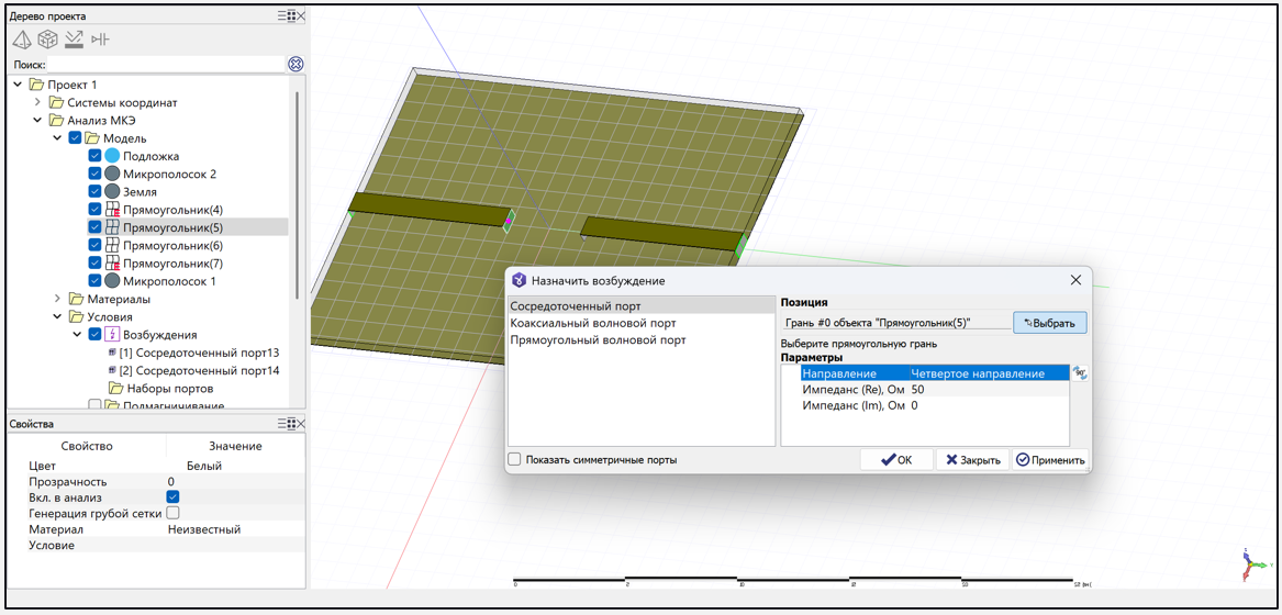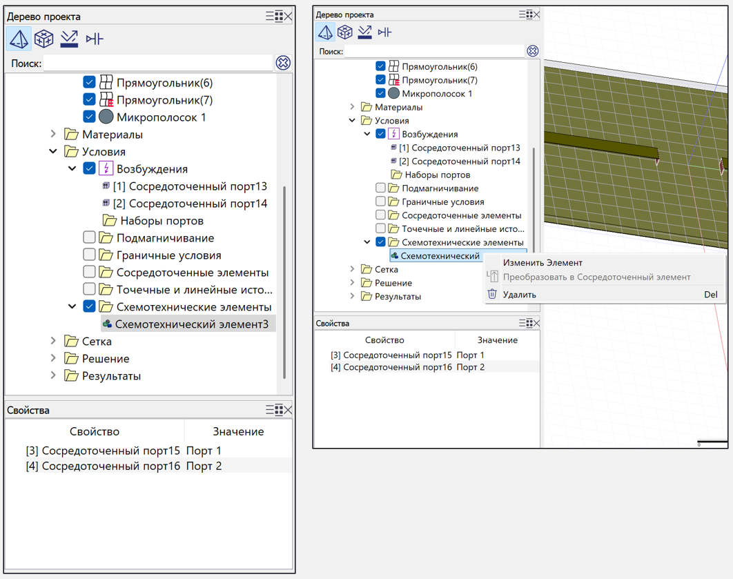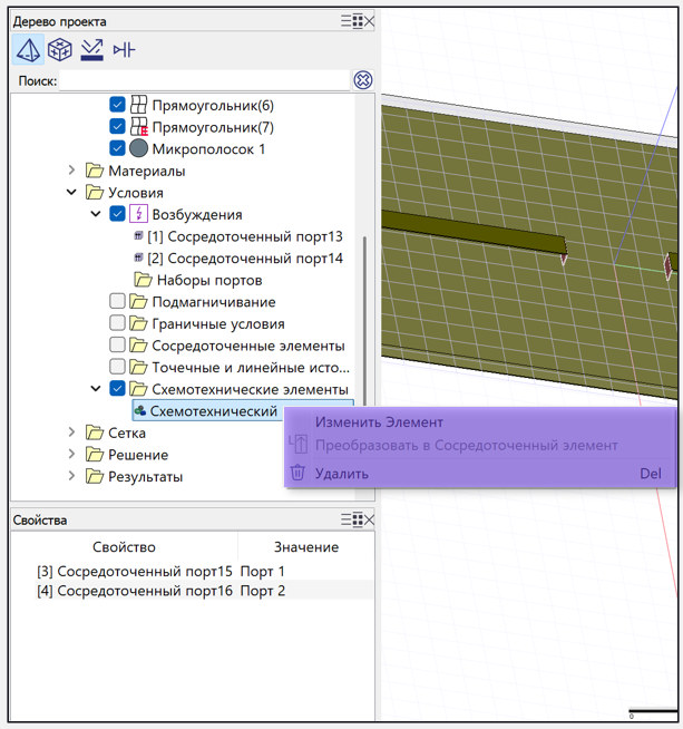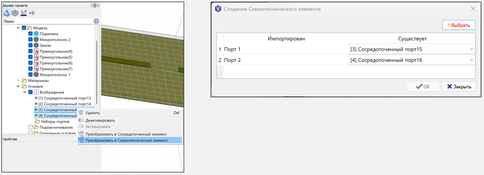 - В папке Условия – Возбуждение выберите нужные порты (Порт 1 и Порт 2), нажмите правой кнопкой мыши и в открывшемся меню выберите Преобразовать в схемотехнический элемент.