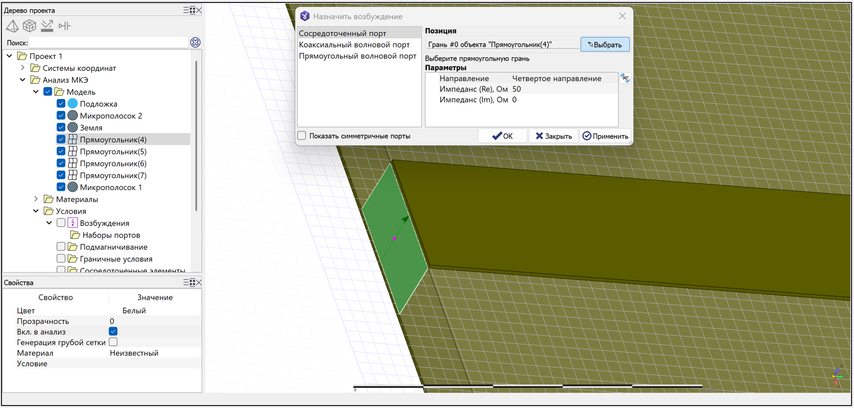 - Создайте стандартные сосредоточенные порты на печатной плате (1 порт входа и 1 порт выхода печатной платы и 2 порта схемотехнического элемента). Для каждого порта выполните следующую команду: Назначить условие > Возбуждение.