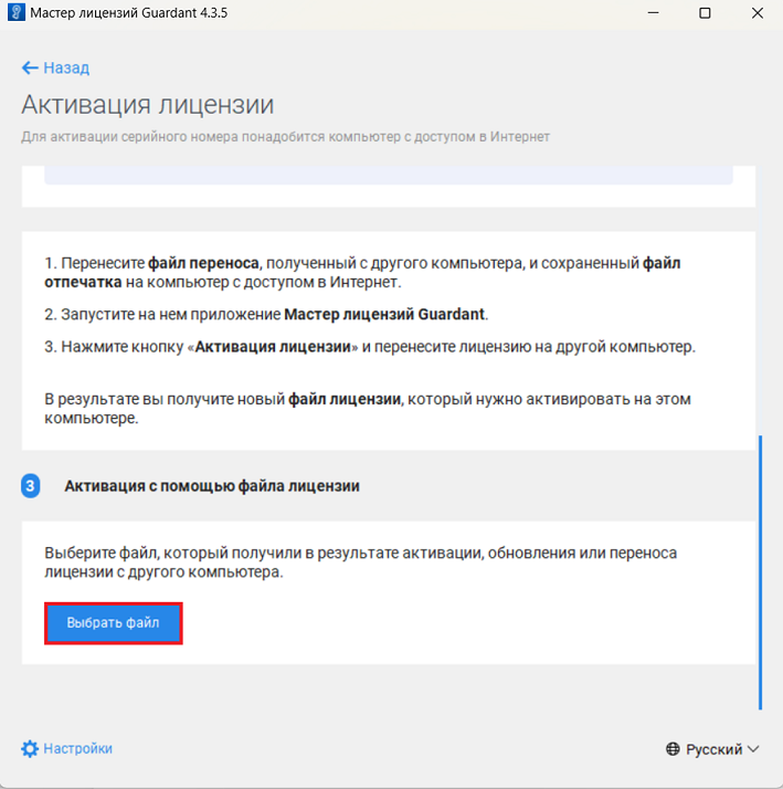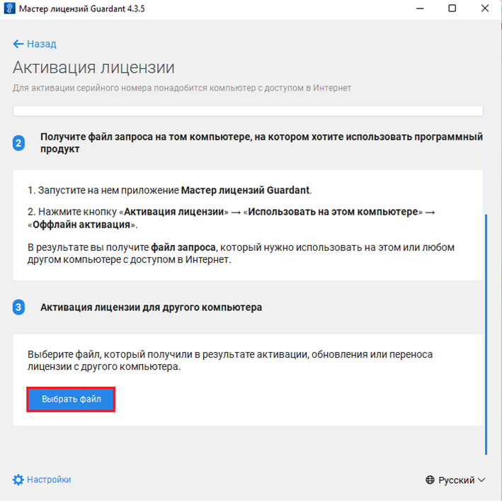 - В секции Активация с помощью файла лицензии нажмите на кнопку Выбрать файл и выберете файл лицензии c внешнего накопителя.