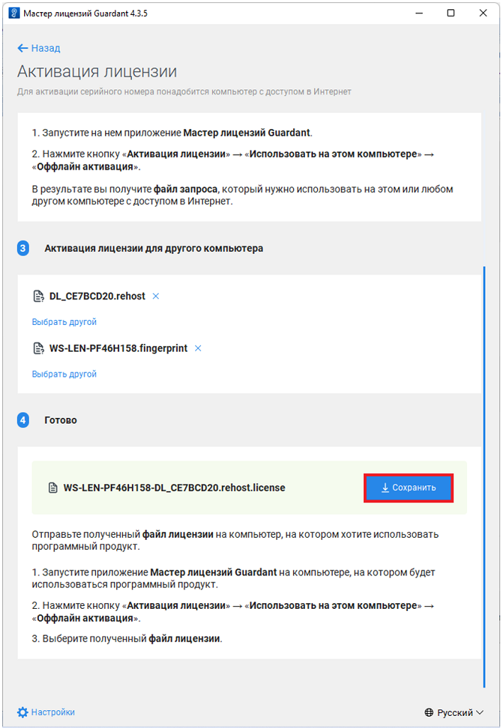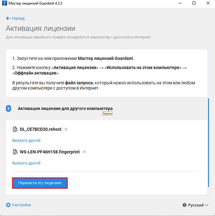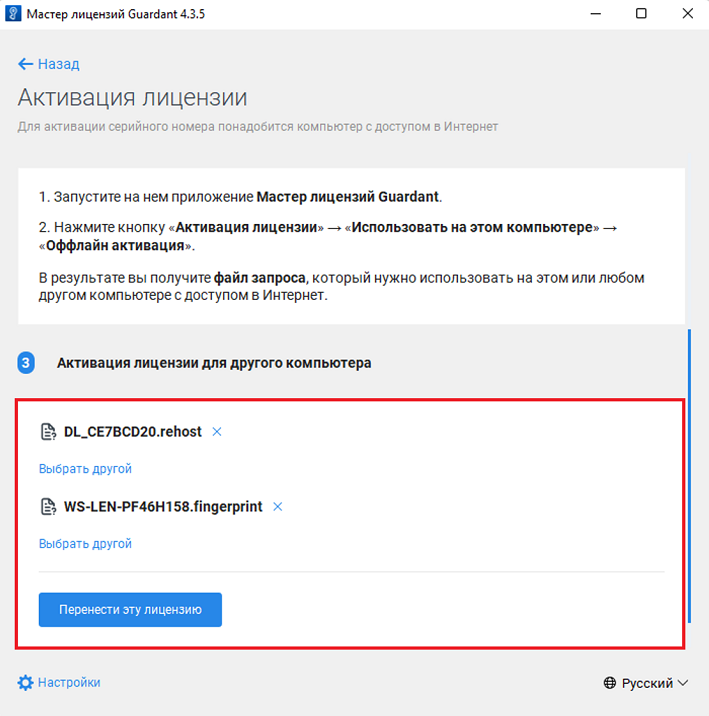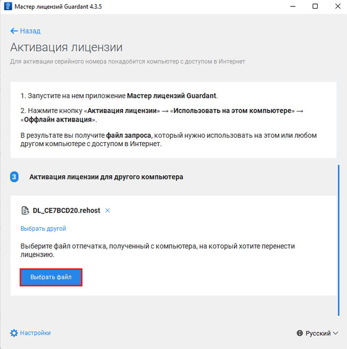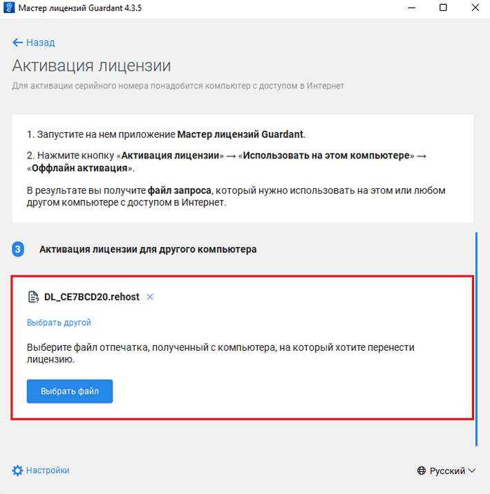- Выберите файл .rehost, который вы получили в результате переноса лицензии с другого компьютера.