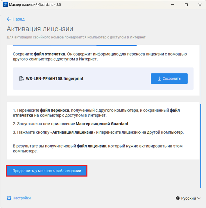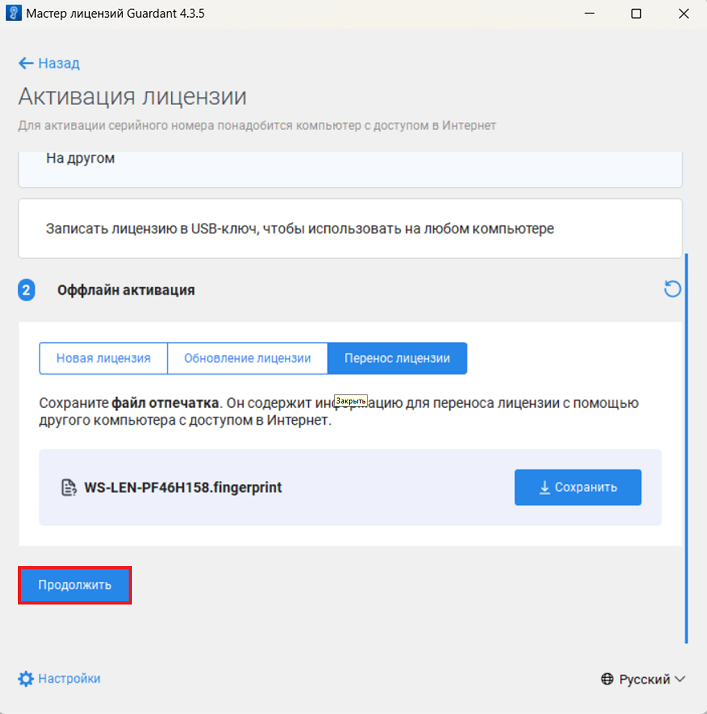 - Выберите пункт Перенос лицензии и нажмите кнопку Сохранить, чтобы сохранить файл лицензии .fingerprint.