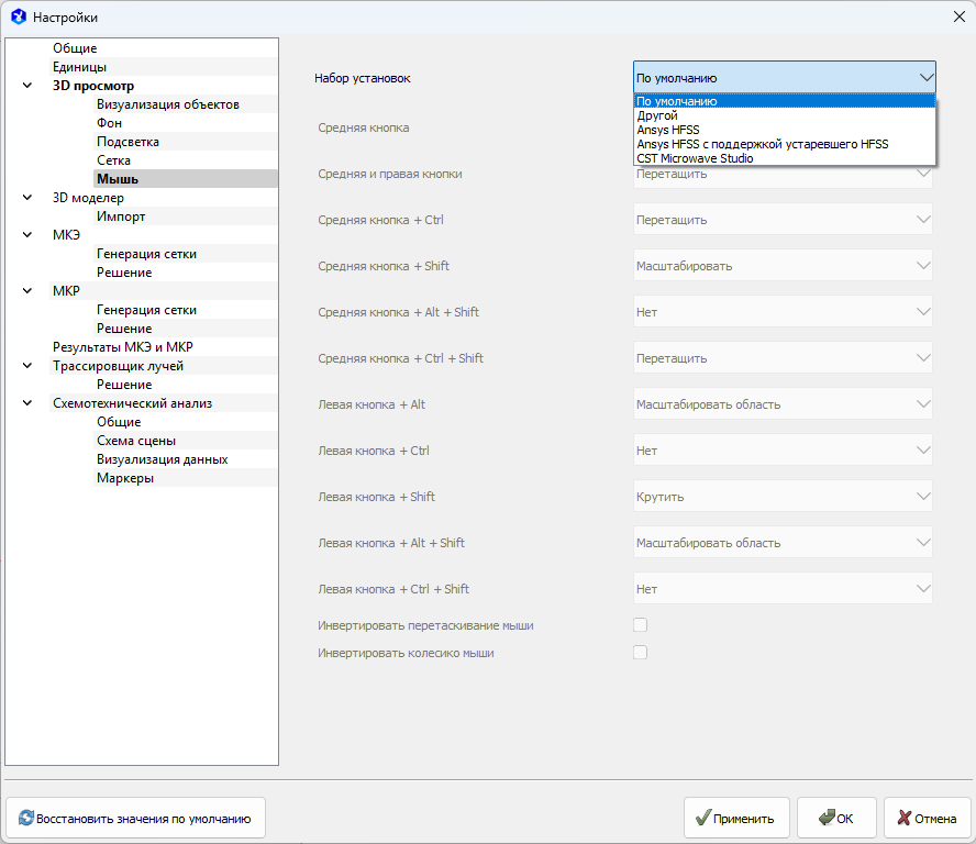 Файл > Настройки > 3D просмотр > Мышь выберите набор установок (профиль) HFSS/CST для управления видом 3D модели с помощью мыши, либо оставьте профиль По умолчанию (GAMMA):