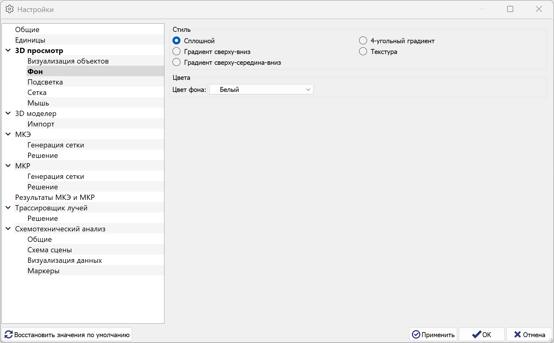 Для настройки рабочего пространства выберите секцию 3D просмотр. Ниже приводится скриншот с настройками фона окна программы: