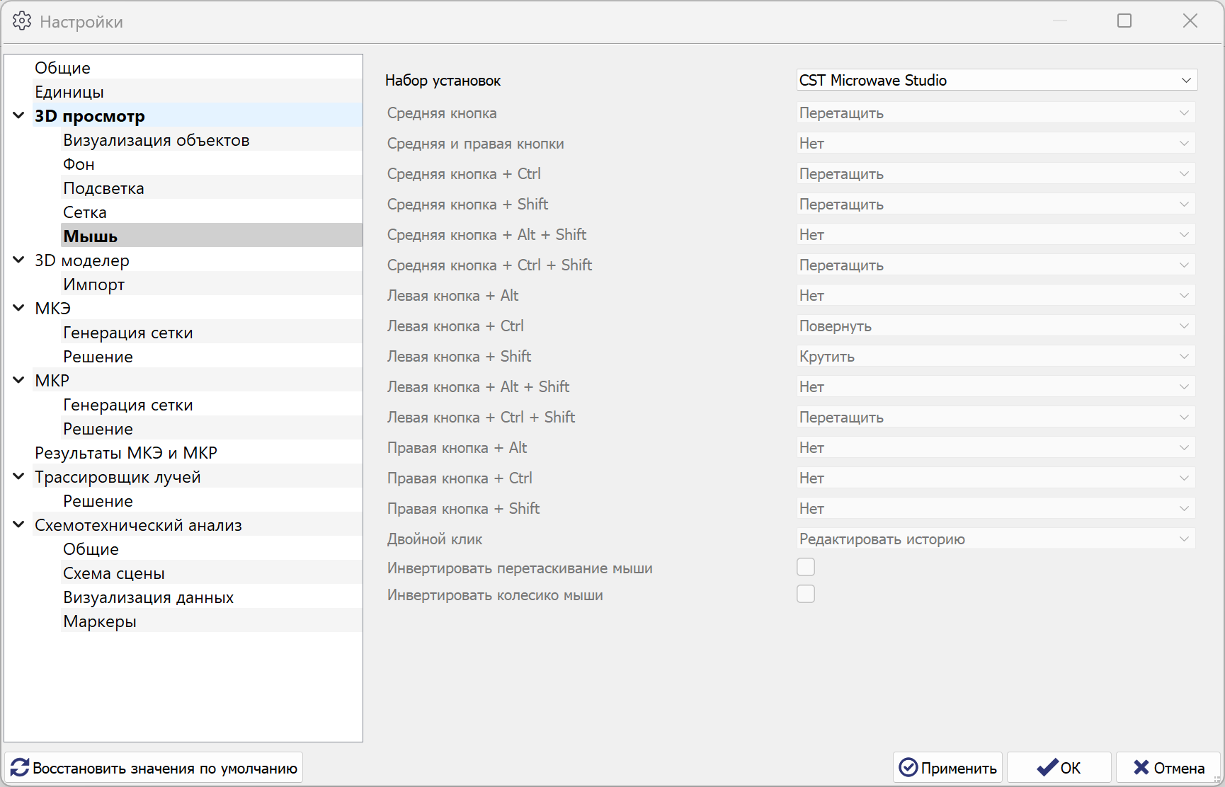 Чтобы настроить управление видом модели с помощью мыши и клавиатуры, в секции 3D просмотр выберите пункт Мышь. В поле Набор установок выберите нужный профиль настроек для управления видом 3D модели с помощью мыши или выберите профиль По умолчанию: