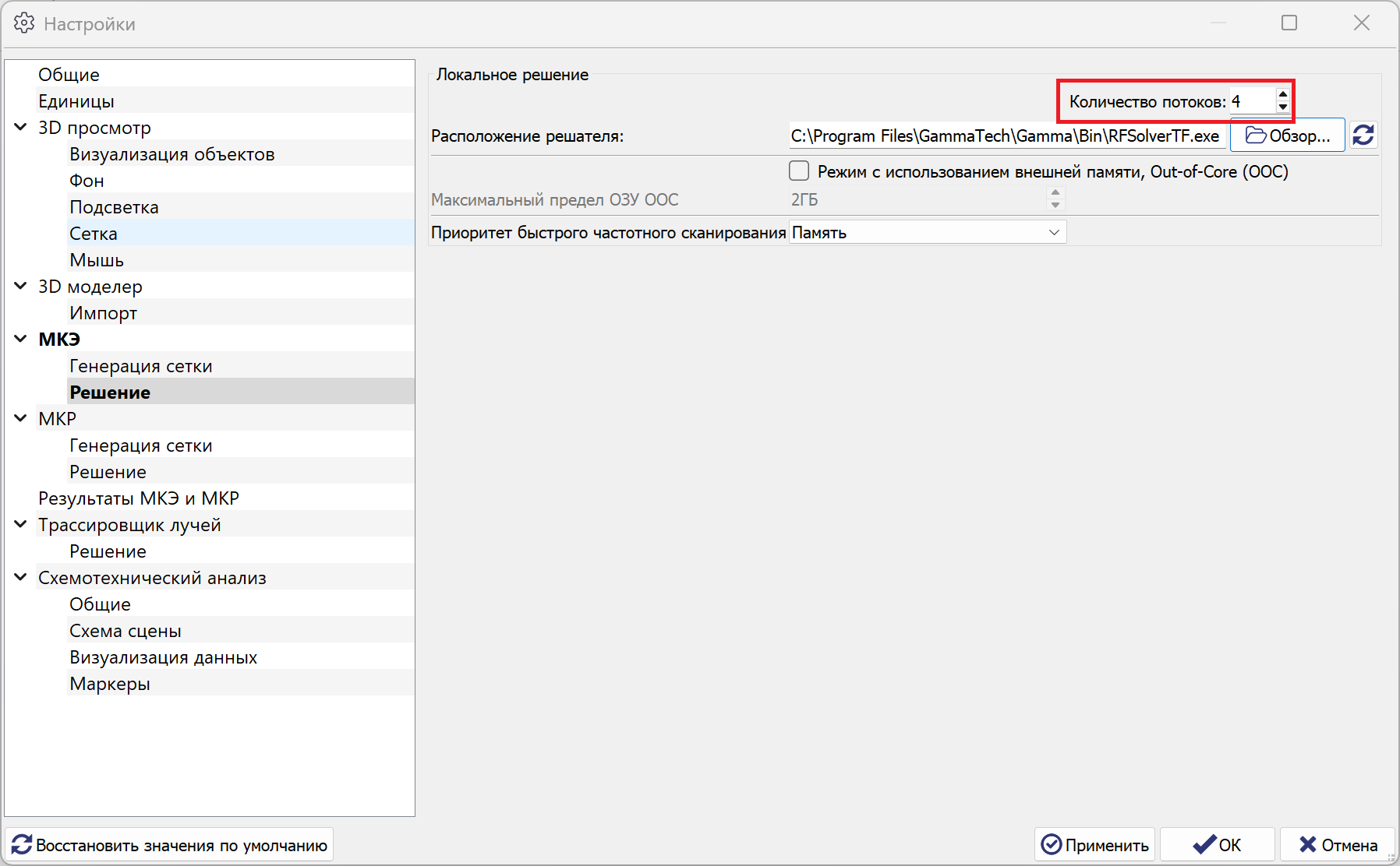 Для настройки количества потоков в секции МКЭ выберите пункт Решение. Убедитесь, что для параметра Количестов потоков установлено значение не менее 2: