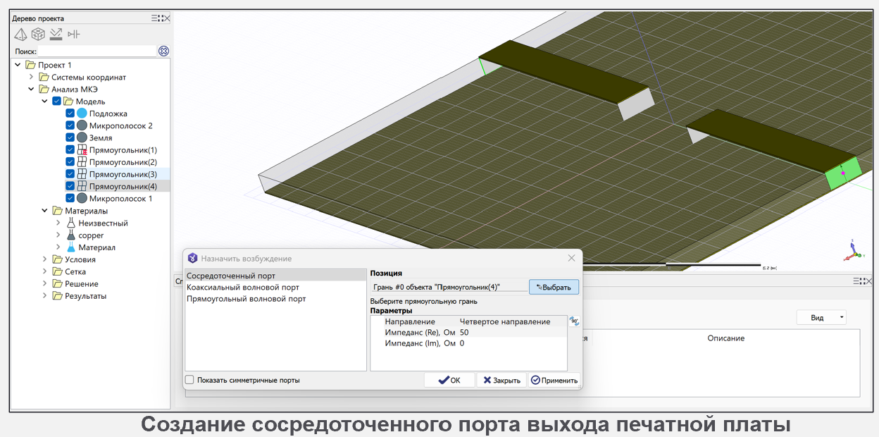 - Создайте стандартные сосредоточенные порты на печатной плате (1 порт входа и 1 порт выхода печатной платы и 2 порта схемотехнического элемента). Для каждого порта выполните следующую команду: Назначить условие > Возбуждение.