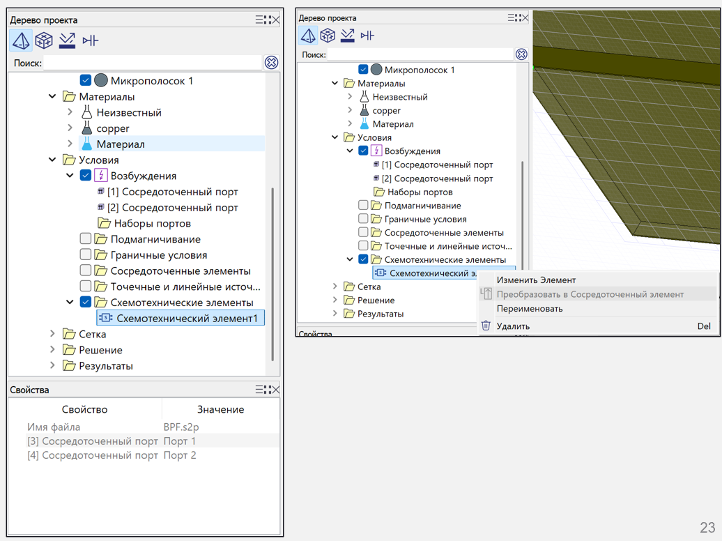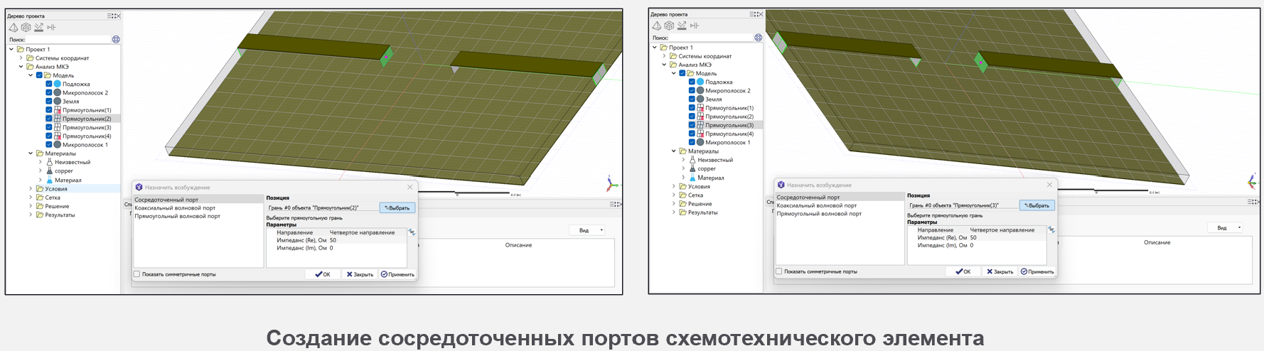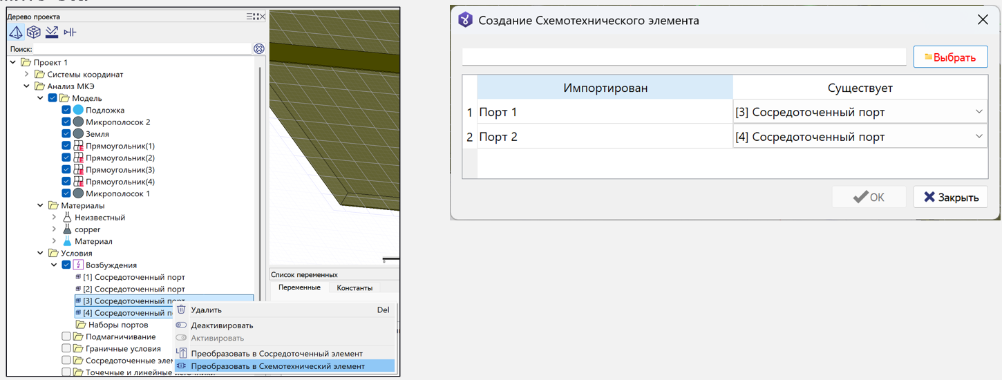 - В папке Условия – Возбуждение выберите нужные порты (Порт 3 и Порт 4), нажмите правой кнопкой мыши и в открывшемся меню выберите Преобразовать в схемотехнический элемент.