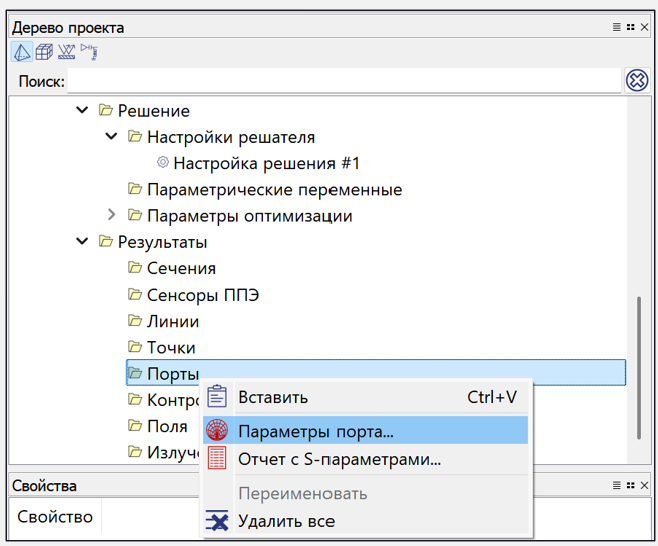 - В папке Результаты кликните правой кнопкой мыши на папке Порты и выберите Параметры порта.