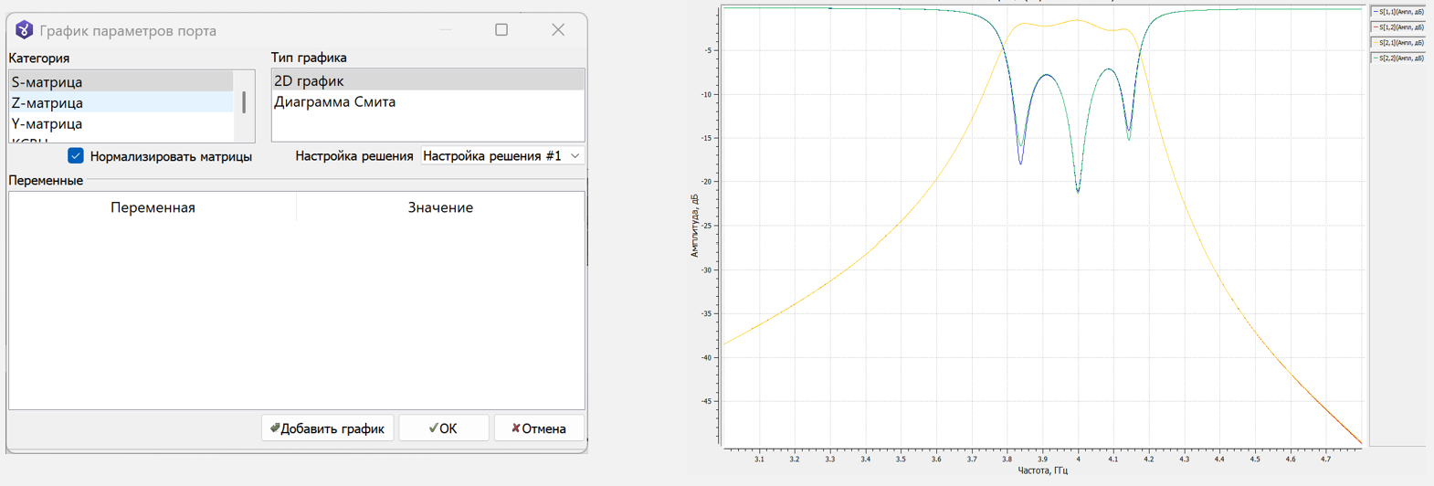 - В открывшемся диалоговом окне проверьте, что в поле Категория выбрано S-матрица, в поле Тип графика выбрано 2D график.